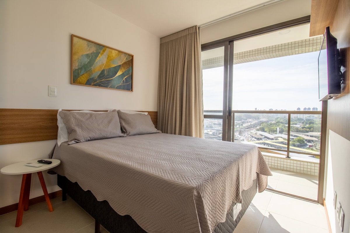 Popolnoma nova suita s čudovito in sodobno dekoracijo v hotelu s 4 zvezdicami na zelo privilegirani lokaciji, pred Salvador Shoppingom. Nahaja se na Caminho das Árvores, eni najbolj prestižnih sosesk v Salvadorju, 100 metrov od postaje podzemne železnice. Ima pametno televizijo, klimatsko napravo, minibar, garderobno omaro, sef, mizo in stol za jedilnico in/ali pisarno ter kopalnico, ki zagotavlja izjemno sproščujočo kopel. Ima tudi brezplačno parkiranje, bazen, fitnes center, restavracijo in igralnico.