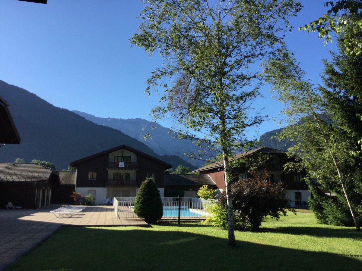 Samoëns, izvoljen za najlepšo vas Haute Savoie 2021, prostorno stanovanje 47 m2 + balkon 8 m2 - 2. nadstropje - 5 oseb Ograjena rezidenca Le Grand Tétras z bazeni (notranji in zunanji), telovadnico in savno, 700 m od vasi, 500 m od smučarskih žičnic, blizu gozda in reke (Giffre), to stanovanje uživa v zelo mirnem in sproščujočem okolju. Smučišče Grand Massif. Brezplačen prevoz Parkirni prostor v nadstropju, shramba za smuči in kolesa