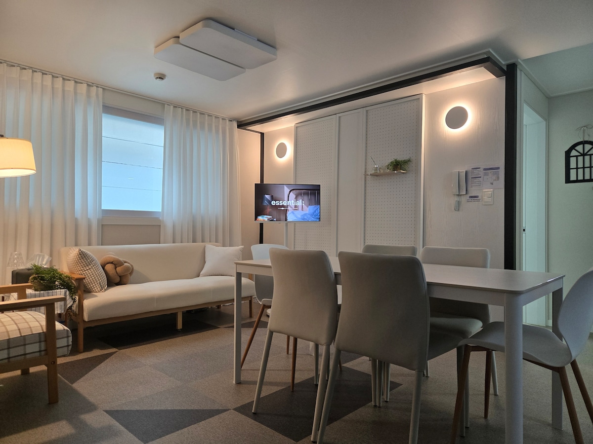 »Naš vesel čas« Daegu Innovation City Lokacija Mir in dober zrak:) Kaj pa zdravljenje v osamljenem prenočišču? Parkirate lahko udobno. Sestavljen je iz 20 pyeong, 2 sob, prostorne dnevne sobe in 1 kopalnice. # spalnica # 1 zakonska postelja v glavni spalnici (Simmons), 1 super enojna postelja (as) 1 zakonska postelja v majhni sobi (as) Vsak dan ga perem in čistim. # Kuhinja # Lahka kuhinja je možna, vendar mazljivo kuhanje (ribe, meso, obara) ni dovoljeno Hvala za razumevanje, da lahko nastanitev uredite čisto:) Hladilnik, mikrovalovna pečica, grelnik vode, lonec, ponev, posoda za kuhanje, jedilni pribor Sklede, skodelice, štedilnik, miza za 4 osebe # Kopalnica # To je sodobna in urejena kopalnica s kopalnico Hanseam Bolje ga je uporabljati higiensko. Trudimo se po najboljših močeh, da bi bila čista. Šampon, gel za umivanje telesa, umivanje rok, osvežilec zraka, zobna ščetka, zobna pasta, brisača, sušilnik, glavnik, brisača za enkratno uporabo # Drugo # 55-palčni Smart TV Netflix Wi-Fi je na voljo Uporabljate lahko pralni stroj:) Voda je na voljo