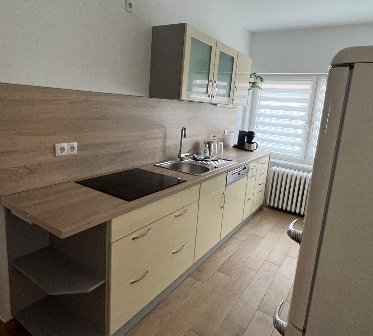 Svetlo, prijazno stanovanje z dnevno/spalnico in otroško sobo, kuhinjo in kopalnico se nahaja ločeno v zgodovinski kmečki hiši, prekriti s trjema neposredno na reki Bodden s pogledom na Schoritzer Wiek. Nahaja se v prvem nadstropju, je udoben in preprosto opremljen. Izjemna je lepota in mir v mojem bivališču. Na lokaciji sem kot gostitelj in tukaj imam svojo umetniško delavnico. Za hišo je vrt.