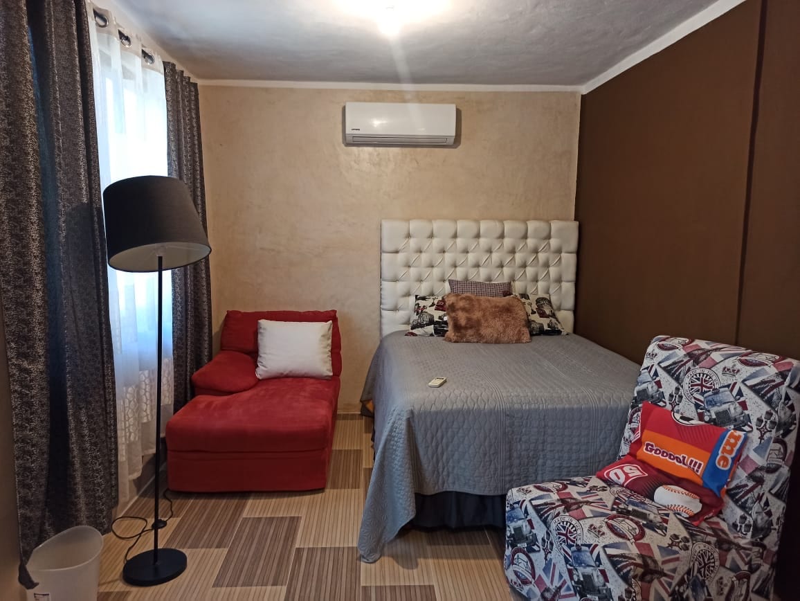 Uživajte v udobnem in mirnem prostoru. Idealno za pare, poslovne potnike ali počitniške izlete. 1 velika spalnica z: *Smart TV ( Netflix) * Inverterska klimatska naprava. *Omara * Zakonska postelja (King) Dnevna soba in jedilnica. – Kuhinja, opremljena za pripravo obrokov z: električnim žarom, hladilnikom, mikrovalovno pečico, aparatom za kavo, cvrtnikom. Kopalnica z vročo vodo. Dodatno: - Parkiranje. - Sprednji in zadnji vrt z gramozom Samostojni vstop s pametno ključavnico