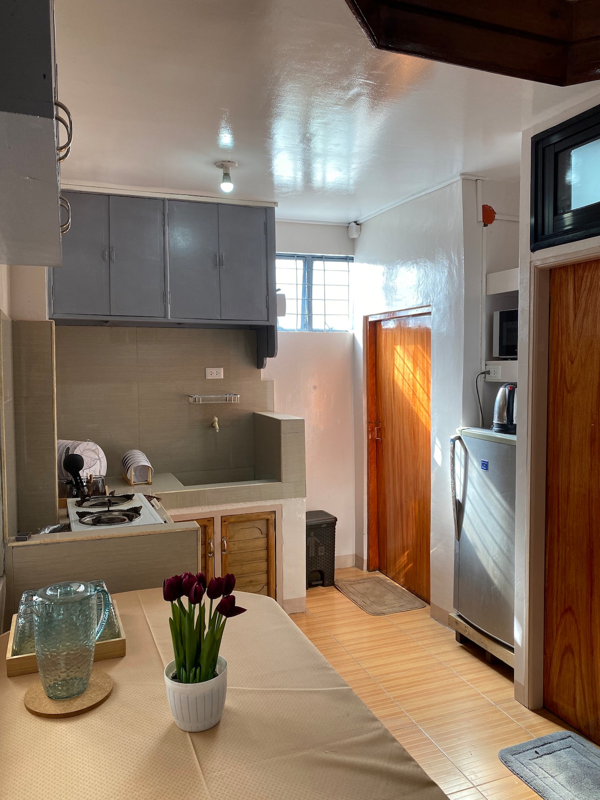 Največ 10 oseb. 3 sobe, 1 veliko podstrešje Soba 1: 1 zakonska postelja (Queen), kavč Soba z 2 enojnima posteljama *Soba 3 – dve nadstropji Predelano stanovanje – 1 zakonska postelja (Queen), 2 enojni postelji, raztegljiva postelja Soba z raztegljivim kavčem in izvlečnim ležiščem 3 postelje in zajtrk, vroča/hladna prha Brisače Popolnoma opremljena kuhinja z brezplačno 19-litrsko (5 galon) steklenico vode med bivanjem Območje balkona Wi-Fi/Smart TV v prenočišču Globe Varnostna kamera To je enota na nižji ravni pod glavnim nadstropjem. Na voljo so stopnice navzgor in navzdol. Prosimo, da se o vremenskih razmerah seznanite na strani PAGASA DOST. Nudimo nastanitev pri družini in ne uporabljamo generatorja.