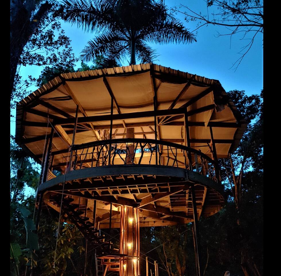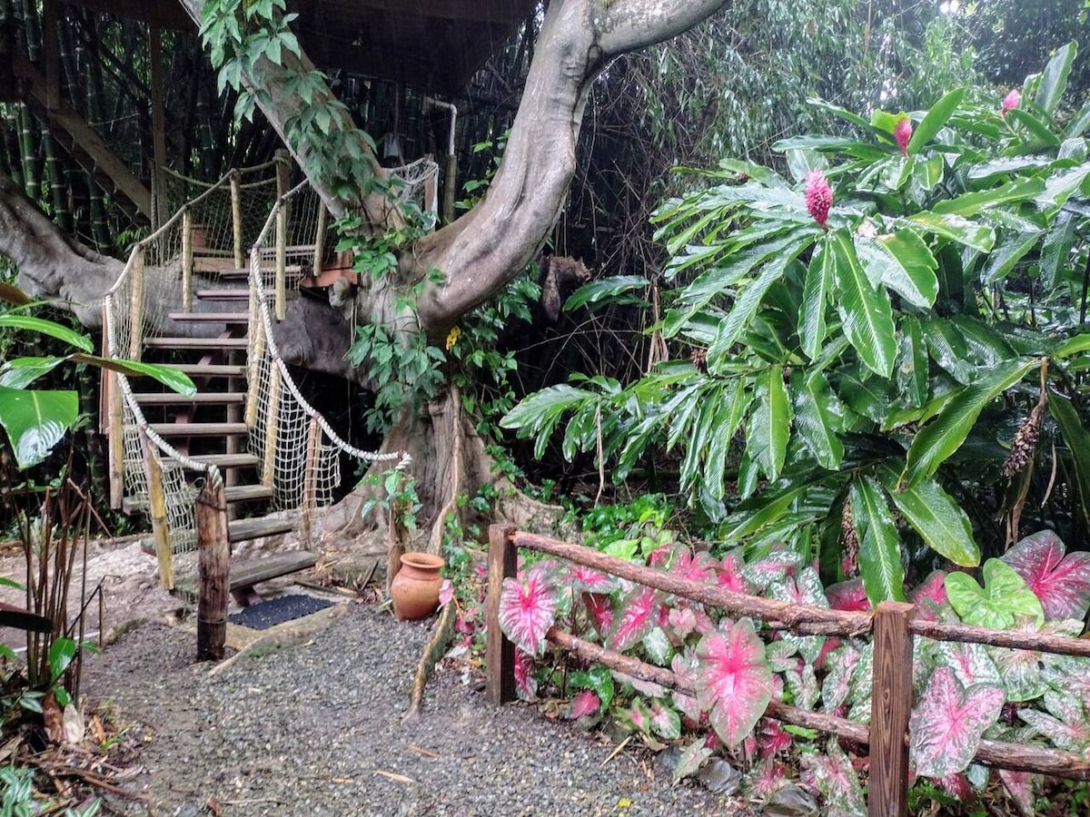Discover the Treehouse of Life where you will experience the magic of our tropical flora and fauna, and rolling rain on a metal roof in rural Puerto Rico "el campo". This is truly a treehouse in a Flamboyan tree, planted 30 years ago for this purpose, it is outdoors, and 20' up with views of the jungle. This unique experience is complete with the occasional visit by bats, birds, geckos and coquis (local frogs). The jungle vibe is evident the moment you enter.