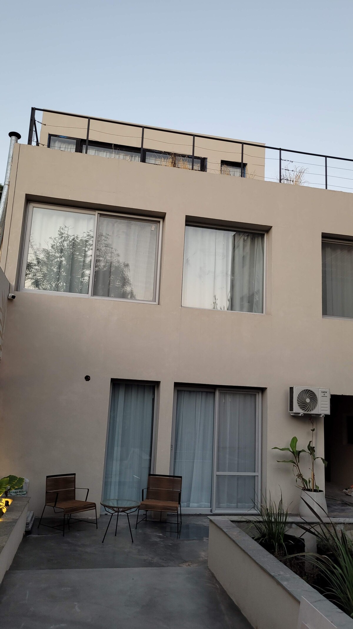 Casa minimalista en planta alta, rodeada de verde, con terraza, gran balcón y vista al hípico. Funciona como 3er piso. Loft luminoso, cama super king, vidrios dobles, losa radiante, aire acond y cortinas blackout en todas las ventanas. Entrada independiente, buen aislamiento. Mi taller está en planta baja con acceso totalmente separado. Ideal para 1 o 2 personas tranquilas que buscan descanso cerca del río y gastronomía, a 30 min de CABA y Tigre. No apta para eventos/producciones.
