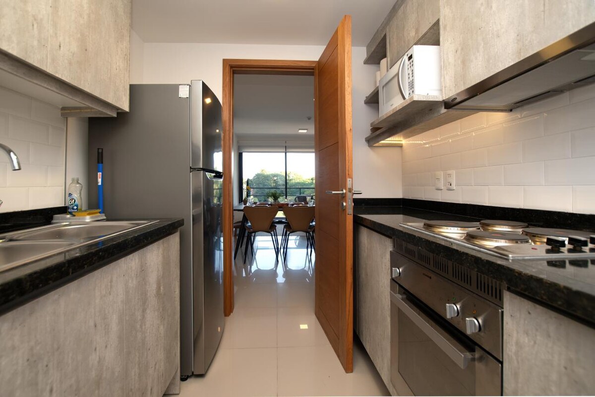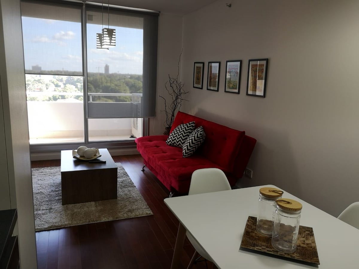Hermoso y acogedor departamento en un edificio residencial, situado en un barrio muy concurrido con grandes centros comerciales y variedad de restaurantes. Ideal para moverse caminando. Relájate y disfruta de una hermosa piscina en la terraza del edificio, y de un completo gimnasio. El departamento está completamente equipado para 4 personas, tanto para estadías largas como cortas. Tiene 2 habitaciones, un baño completo y un baño social, cocina completa, living comedor, y balcón. Enjoy!