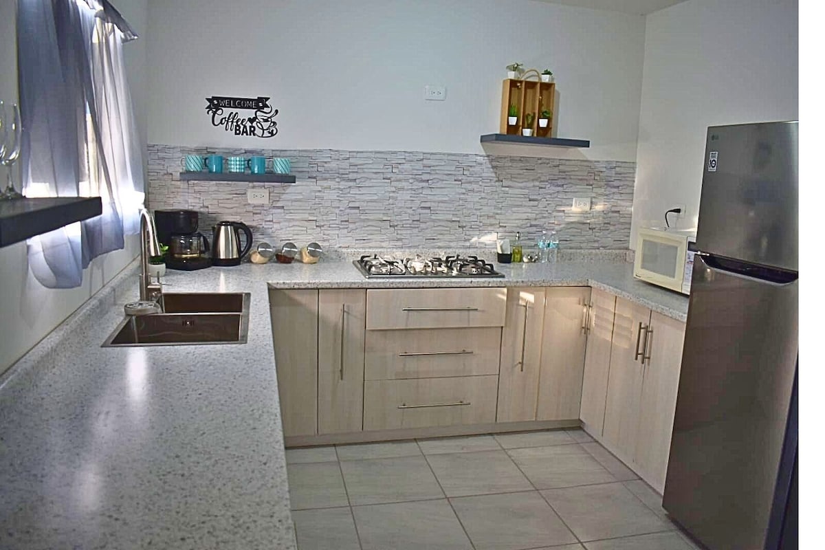 Un elegante alojamiento con amplia sala de estar, recámara principal tamaño Queen con baño privado, clóset, TV y escritorio. Una segunda recámara en espacio abierto con cama Queen, clóset, TV y escritorio. Un 2do baño completo adicional para visitas, recibidor, cocina equipada, con estufa de gas, Relájate en un jardín compartido con asador listo para una carnita asada bajo la sobra de espectaculares bambú en una mesa de jardín. Llega caminando a una cuadra al IMSS