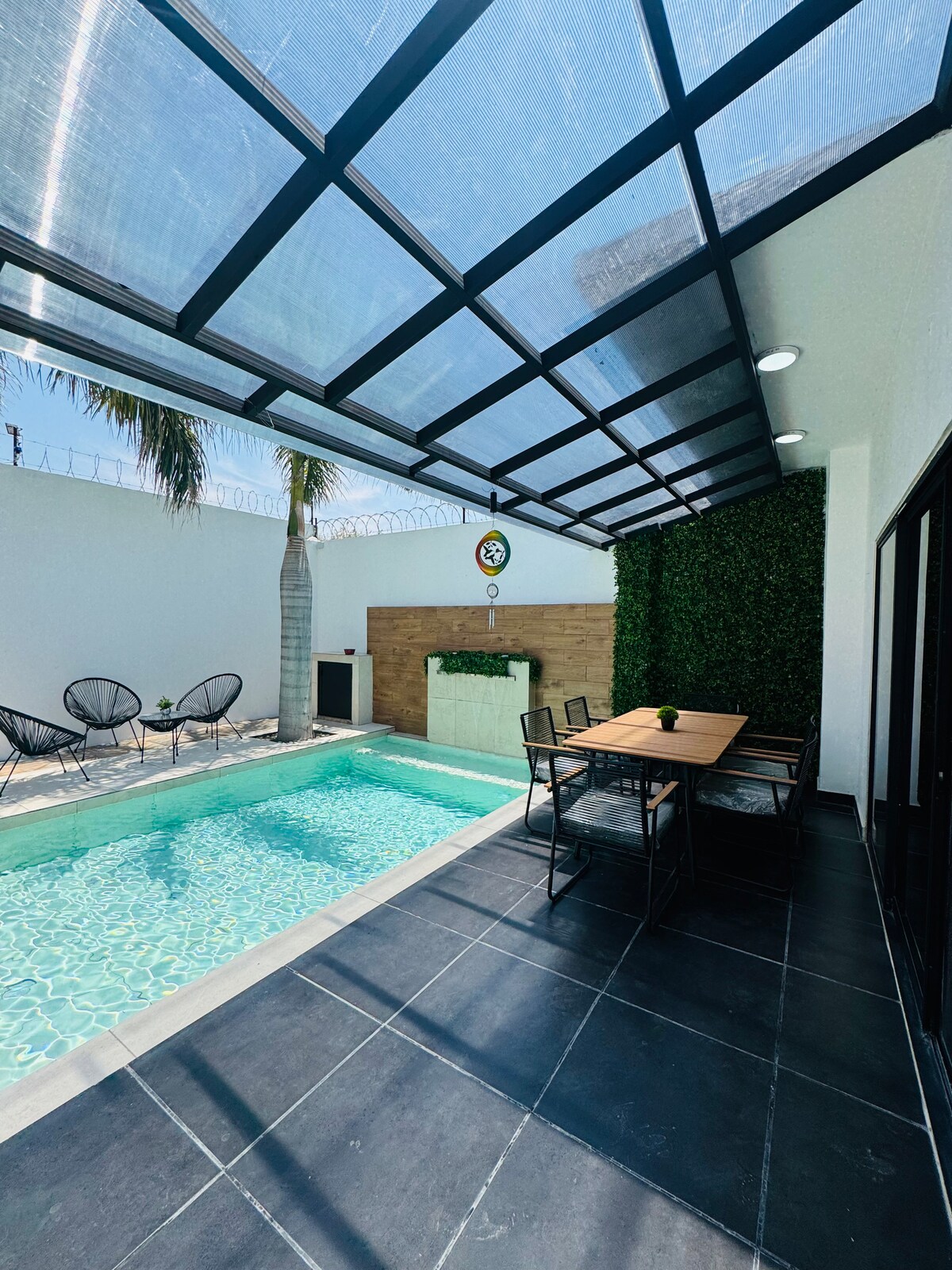 Prostorna hiša z bazenom in zasebnim vrtom. Največje število gostov je 10, vendar se cena določi glede na število oseb, ki bivajo v prenočišču. Bazen ima sončne celice. V golf klubu za tiste, ki imajo radi ta šport. Idealno za družine, ki potujejo z otroki, ki želijo preživeti konec tedna in se sprostijo. Ima bližnje restavracije in samopostrežne storitve. Blizu prireditvenih dvoran, živalskega vrta, vodnega parka, čarobnih vasi in lagune Tequesquitengo