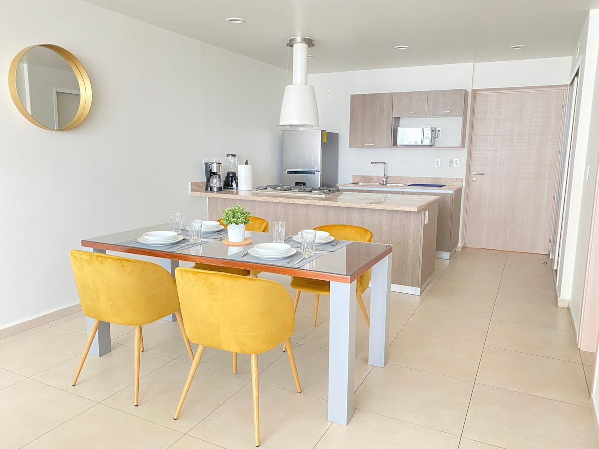 Departamento de Lujo, en la mejor zona, fácil acceso, cerradura inteligente (abre con código), amplio estacionamiento, 8 elevadores, seguridad 24 hrs, Amenidades (Gym, Jaccuzy, Cine, Cafetería, Alberca, Ludoteca), vista inmejorable, piso 31, mobiliario de alta calidad, sala con Smart TV de 60" 4K Ultra HD y de 43" en la habitación, recamara italiana, ropa de cama de lujo, colchón premium de memory foam, toallas premium, cocina equipada, wifi, sofá cama. Son bienvenidas todas las personas.