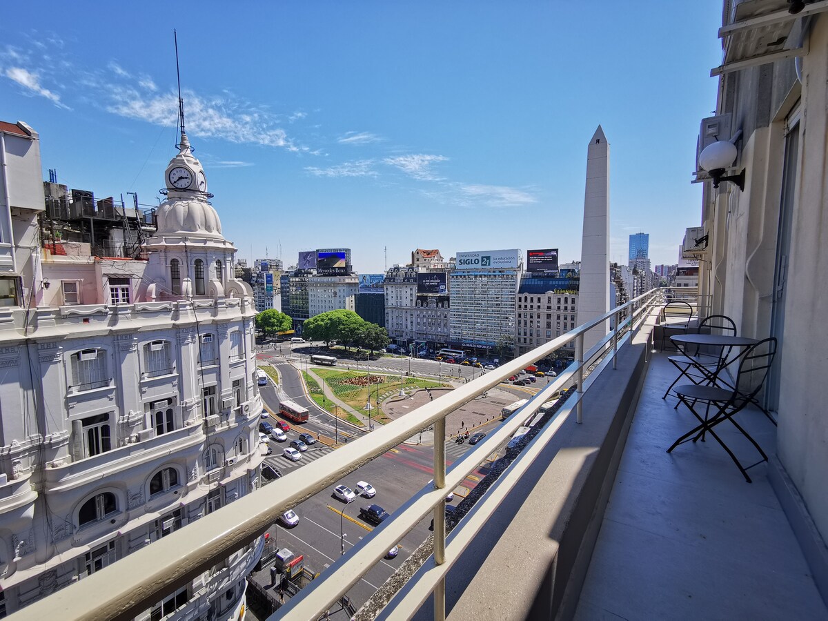 Nahaja se v utripajočem osrčju mesta in je bila pred kratkim prenovljena ter združuje prvotni slog stavbe iz leta 1936 s sodobnim udobjem. Nahaja se v zgornjem nadstropju vogalne stavbe, z 24-urnim varovanjem in 2 dvigaloma. Ima 2 spalnici in balkon z rastlinami, od koder lahko uživate 270° pogled na Obelisk, 9 de Julio Avenue in Corrientes Ave. Klimatska naprava v obeh spalnicah, pralni stroj, WI-FI, popolnoma opremljena kuhinja, sodobna in elegantna.