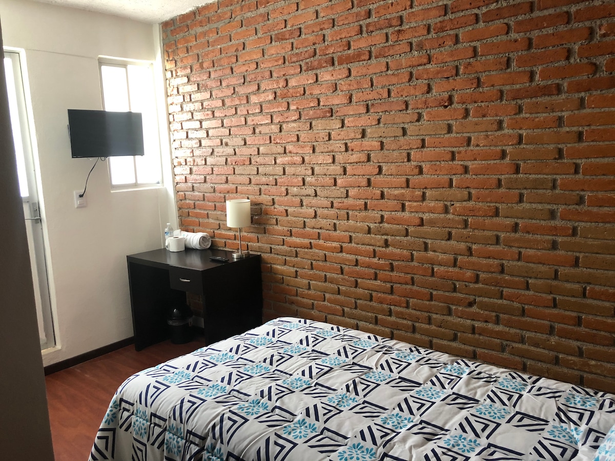 Disfruta de este cálido alojamiento monoambiente de espacios abiertos sin muros increíble para descansar y realizar tus actividades elementales cuenta con un amplio jardín, entrada independiente y cochera para un vehículo, una agradable cocina, pequeña sala de televisión y un espacio con dos camas matrimoniales se encuentra a 5 minutos de plazas comerciales y a 20 minutos del centro histórico