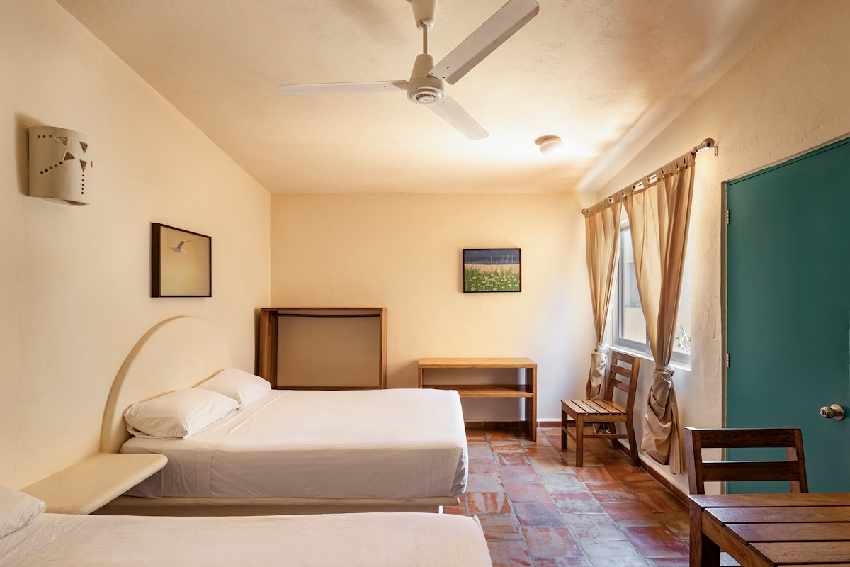 Bungalow para 4 personas a menos de una cuadra de la playa. Cuenta con una habitación con cama queen size y matrimonial, baño completo privado y balcón. Aire acondicionado en la habitación y ventiladores de techo en habitación y sala/cocineta. Además te ofrecemos Wi-Fi, alberca climatizada (en invierno), toallas de alberca en la habitación, limpieza incluida, vigilancia 24/7 y estacionamiento gratuito sujeto a disponibilidad. Algunos bungalows tienen vista periférica a la playa.