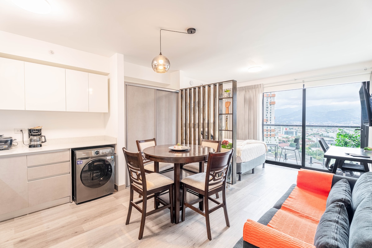Sodobna in elegantna garsonjera v 14. nadstropju s čudovitim pogledom na sončni zahod. Nahaja se v osrčju kraja Barrio Escalante, v bližini barov in odličnih restavracij s široko paleto kulinarike, pred eno od najboljših 100 kavarn na svetu. Idealno za pare, samostojne popotnike ali digitalne nomade, ki iščejo udobje na varni in dostopni lokaciji. Escalante je kulturno in gastronomsko središče San Joseja z aktivnim lokalnim življenjem ob vsakem času dneva.