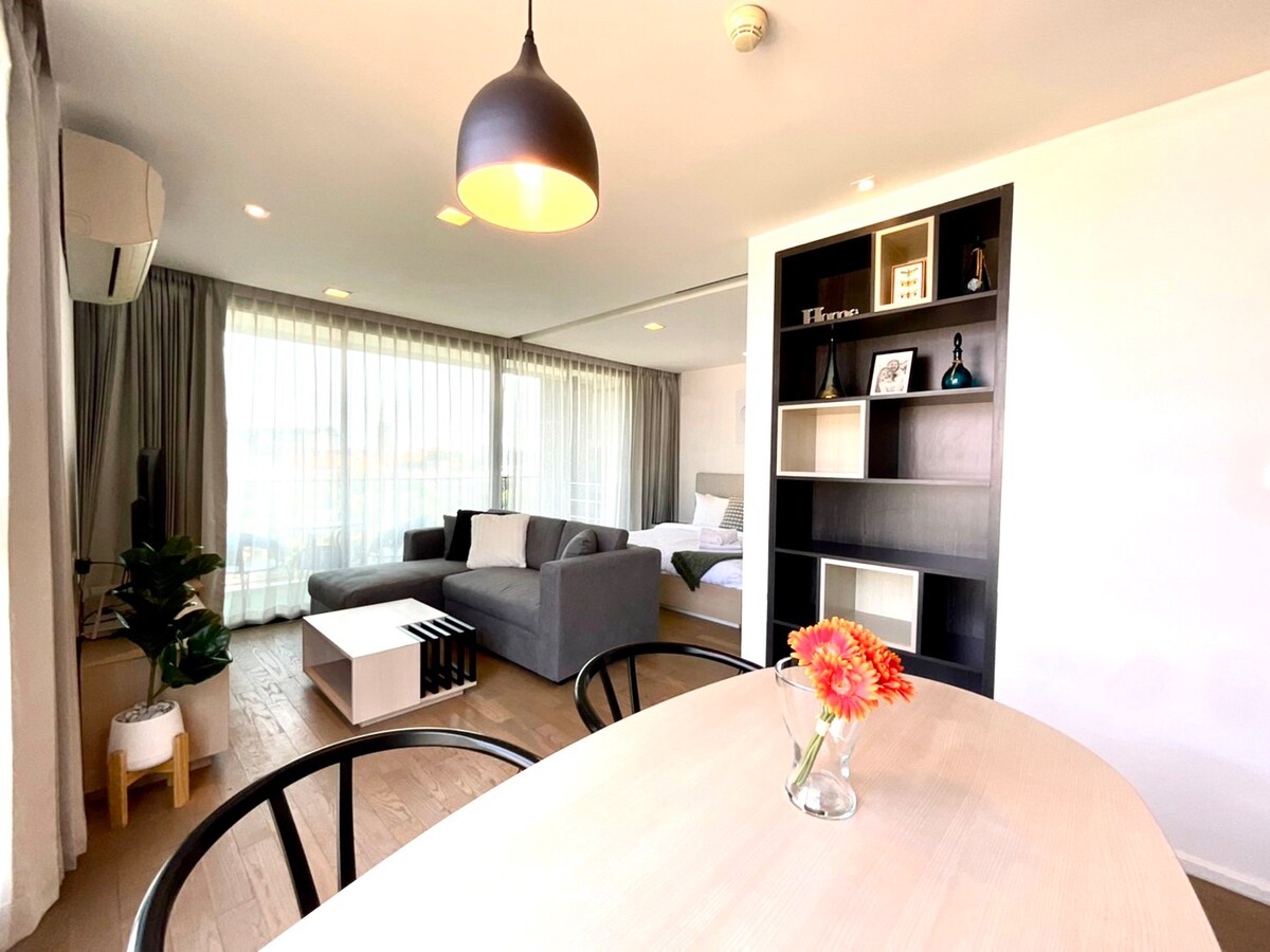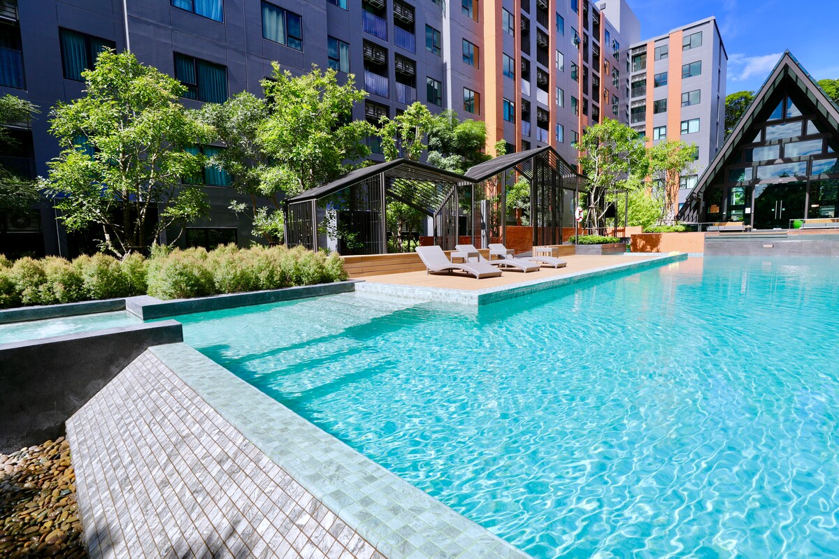 ✨ Modern Loft Style @ Center of Nimman! Stay in unparalleled style. This 31m² one-bedroom loft on the 4th floor offers a nice mountain view and chic, contemporary decor. You are surrounded by trendy places. Hang out at our signature rooftop pool and sky fitness while enjoying breathtaking sunsets—it's the perfect reward! You're in the center of the action: 5 min walk to One Nimman/Maya; 2 mins to chic bars/cafés. Complimentary indoor parking and a lovely garden. Book your stylish stay today!