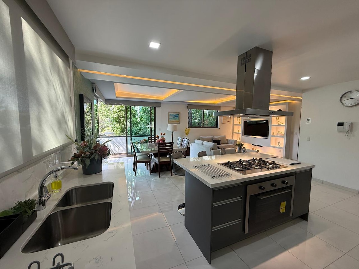 Minimalist apartment in Mexico City. Excellent apartment with jaw dropping view, it has two bedrooms, kitchen, bathroom, laundry room, living room, elevators, parking place and 24/7 security. Excelent location to visit the main attractions of the city, we are at 30 minutes from Polanco, Roma / Condesa, the capital's downtown. In addition, the neighborhood has great places such as parks, museums and restaurants among other things.