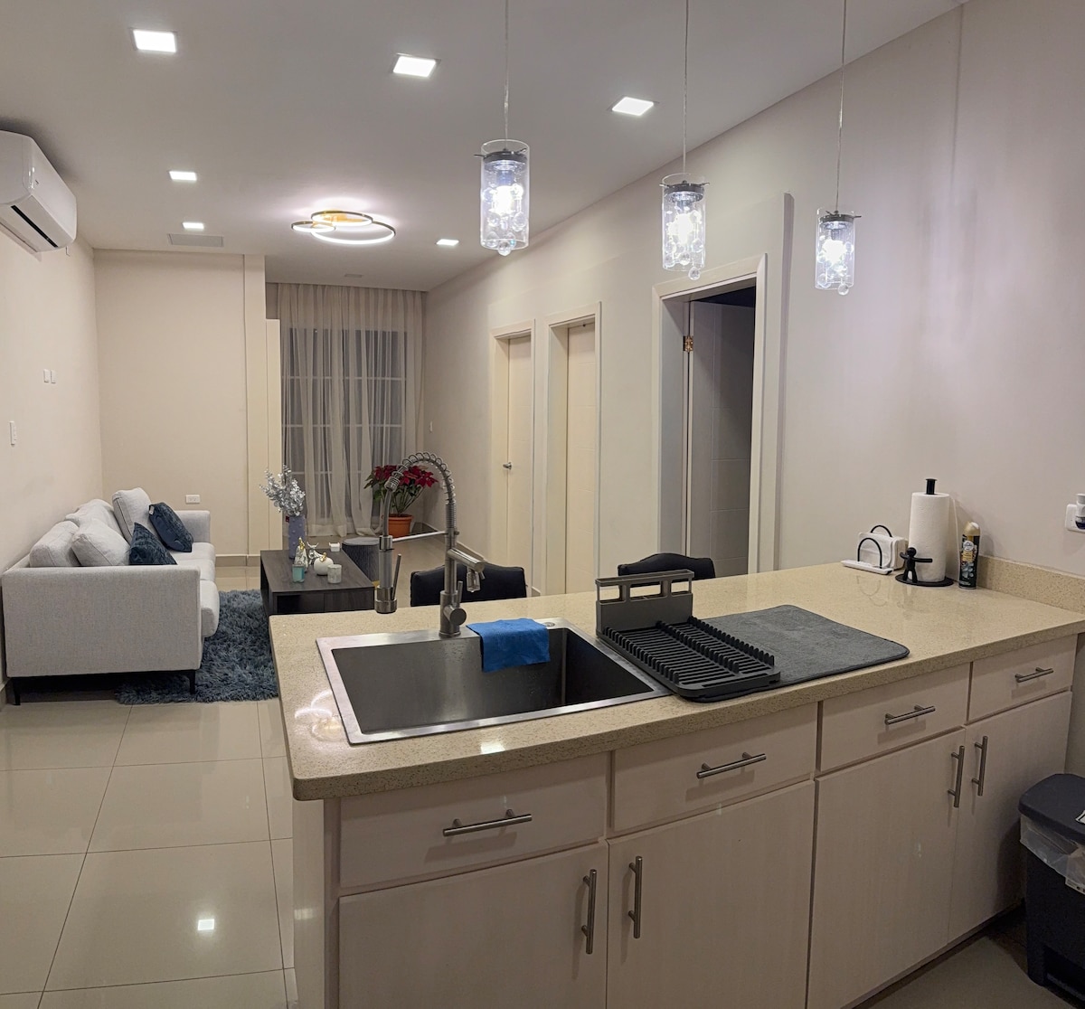Pensado y diseñado con Lujo y Comfort en una zona muy tranquila y segura. Encontraras Supermercados,Malls y restaurantes en un radio de 20 cuadras y está a 15 min del aeropuerto . Las 3 habitaciones modernas están separadas para mayor privacidad y cuentan con su propio baño con agua caliente . Parqueo privado para dos vehículos dentro de la propiedad y cocina moderna . El check in es completamente autónomo con un código de acceso que permite mayor flexibilidad y tranquilidad .