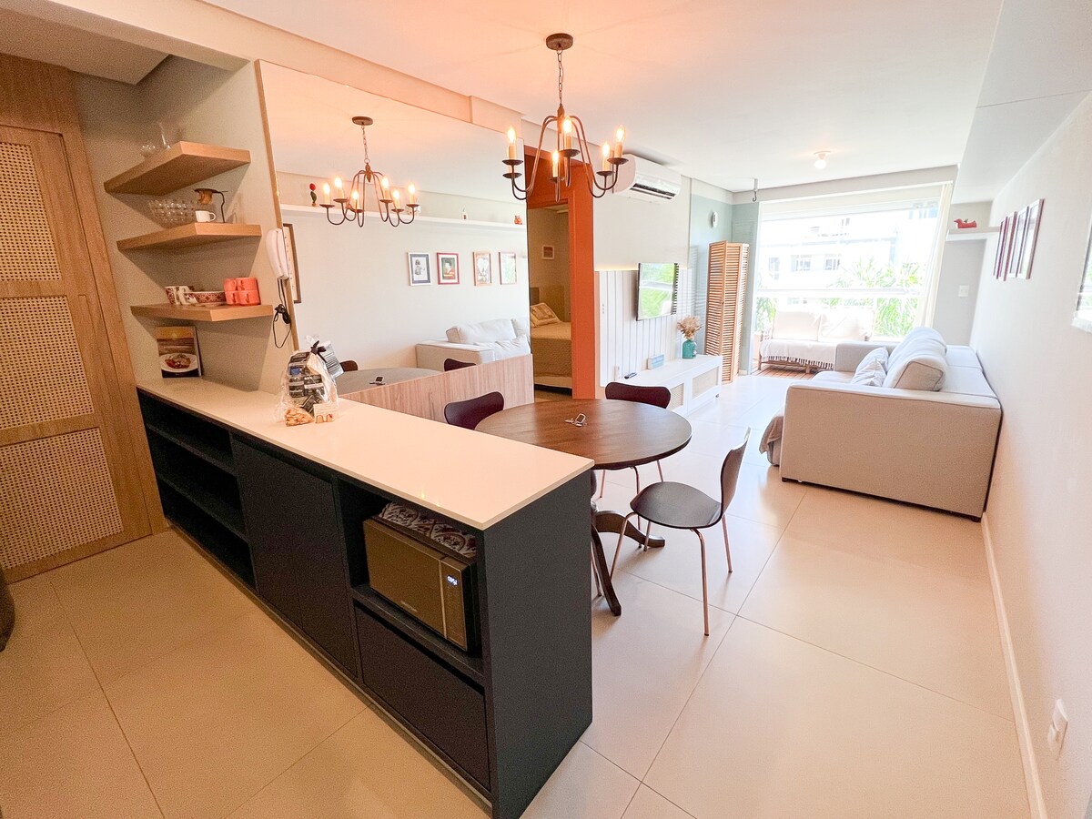 Stanovanjsko stanovanje z odlično strukturo (tip kluba), idealno za družinske počitnice ali domačo pisarno. Stanovanje je dobro osvetljeno, z mizo v sobi in mizo na balkonu, kar je idealno za domačo pisarno. Ima hiter Wi-Fi, TV 50’ in Net kanale. Stanovanje je zaprto, z 24-urnim hišnim upraviteljem in zasebnim dostopom do Lagoe da Conceição, ki je varen za otroke. Ima zunanje in ogrevane bazene, savne, teniško igrišče in igrišče. Parkirno mesto je pokrito. Blizu trgovine, tržnic in lekarn.