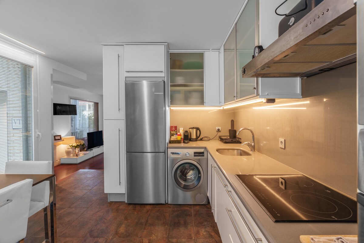 De estilo urbano y acogedor, este nuevo apartamento de un dormitorio con cama kingsize y sofá cama (144x180cm)se encuentra en el corazón del barrio de Gros, a 1 minuto a pie del centro de la ciudad Impecablemente recién reformado cuenta con aire acondicionado, televisión 55", Wifi, Nesspreso. Completamente equipado para niños y bebés. Perfectamente ubicado a 2 minutos de la estación de autobuses y de trenes, así como al lado de una parada directa de autobús para el aeropuerto de San Sebastián.