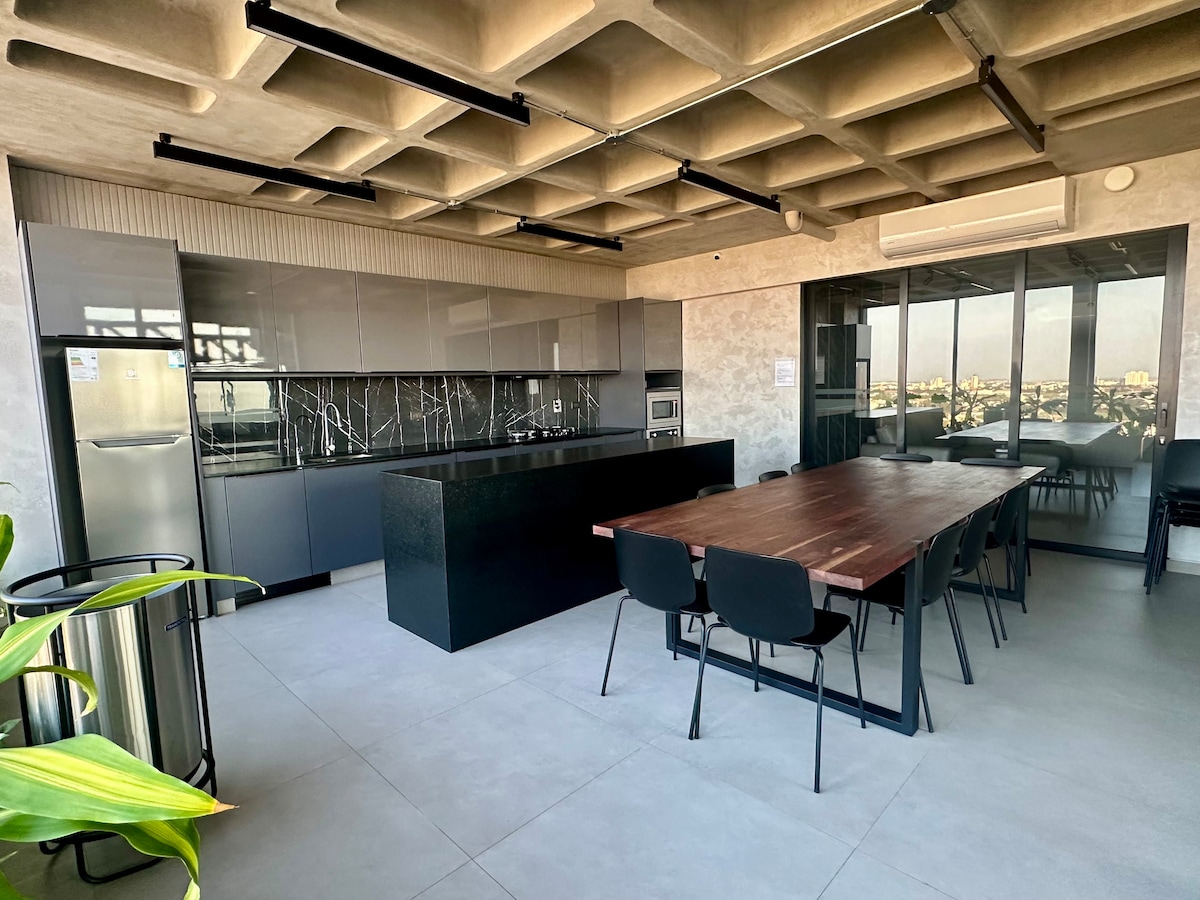 Uživajte v tem sodobnem stanovanju v 15. nadstropju s spektakularnim razgledom z balkona. Idealen za poslovna potovanja ali oddihe, ima opremljeno kuhinjo, jedilni pribor, raztegljiv kavč, 2,5-sedežno posteljo, 50-palčni televizor, pametno ključavnico. Stanovanje ponuja skupni delovni prostor, kino, pametno telovadnico, bazen na strehi, žar in popolnoma opremljeno kuhinjo za skupno uporabo. Nahaja se v Equipetrolu, najboljšem območju SCZ.