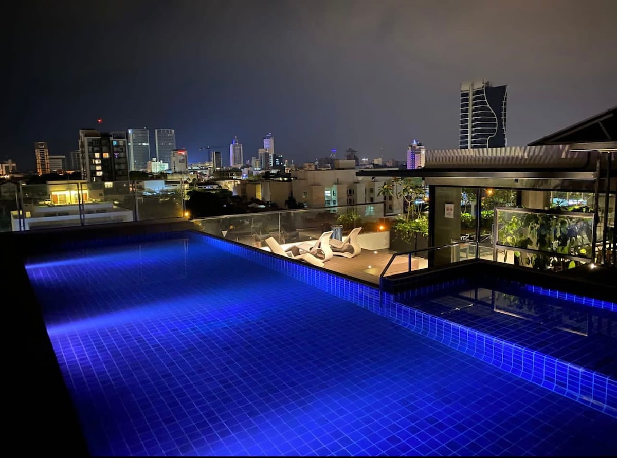 Uživajte v tem sodobnem stanovanju v 15. nadstropju s spektakularnim razgledom z balkona. Idealen za poslovna potovanja ali oddihe, ima opremljeno kuhinjo, jedilni pribor, raztegljiv kavč, 2,5-sedežno posteljo, 50-palčni televizor, pametno ključavnico. Stanovanje ponuja skupni delovni prostor, kino, pametno telovadnico, bazen na strehi, žar in popolnoma opremljeno kuhinjo za skupno uporabo. Nahaja se v Equipetrolu, najboljšem območju SCZ.