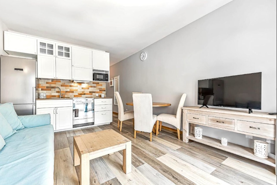 Stanovanje je sestavljeno iz spalnice z dvema posteljama in dnevne sobe s kuhinjsko nišo. Zasnovan je za 4 osebe, zelo udoben kavč v dnevni sobi se razteza na 140 x 200 cm. Stanovanje je opremljeno z električnim štedilnikom brez pečice, hladilnikom, vsemi potrebnimi kuhinjskimi pripomočki - krožniki, lonci, grelnikom vode, italijanskim aparatom za kavo. V kompleksu je ogrevan bazen, teniška igrišča, namizni tenis, biljard.