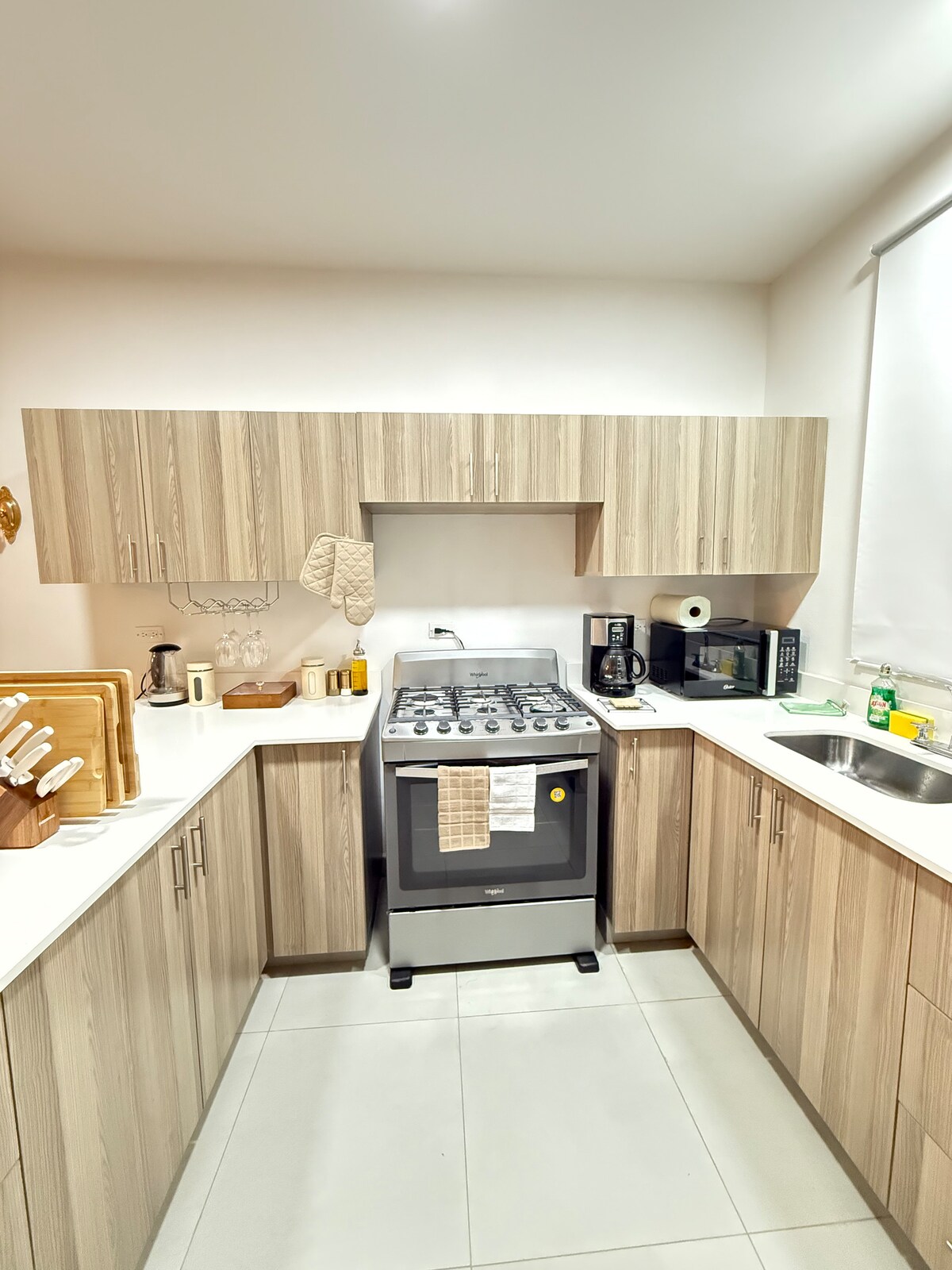 Disfruta de una experiencia con estilo en este alojamiento céntrico. -Zona cerrada -Portones automaticos -Parqueo incluido -Comercio cercano -Zona silenciosa y segura. -Seguridad en el porton. Apartamento incluye: -Lavadora-secadora. -Cafetera. -Cocina y horno. -Microonda. -Refrigeradora. -Aire acondicionaso (dormitorio) -Tv en dormitorio y sala. -Area de trabajo. -Sofa cama en sala. -Cafe de coetesia.