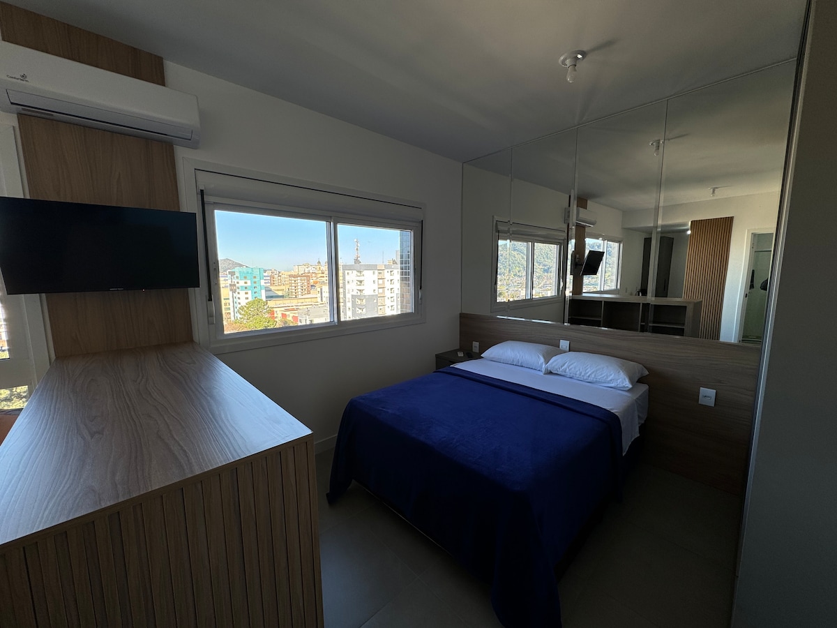 Apto Studio localizado no centro de Sta Maria, predio novo, esquina com UFN, próximo ao calçadão, supermercado, bares. restaurantes e Pubs. Possui 1 cama de casal, ar condicionado split, TV Smart , closet aberto, cozinha equipada, banheiro, sala com estofado e mesa de estudo. -Prédio com lavanderia( pagto por conta do hóspede) -Prédio com academia. Apto no décimo andar com linda e ampla vista da cidade. Possui Wi-Fi de 350mega. Venha conhecer e se encantar com a vista incrível da cidade.