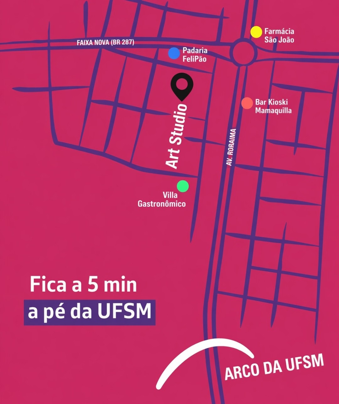 Studio novíssimo que faz divisa com a UFSM. Em poucos minutos a pé, você estará dentro do campus. Localizado no último andar de prédio com elevador, o espaço foi pensado com muito carinho para oferecer conforto, praticidade e descanso. Ambiente moderno, completo, silencioso e aconchegante, com sacada e tudo o que você precisa para uma ótima estadia. Acomoda duas pessoas, com opção de colchão extra para uma terceira, se necessário. Interesse em aluguel mensal, me chame para conversarmos.