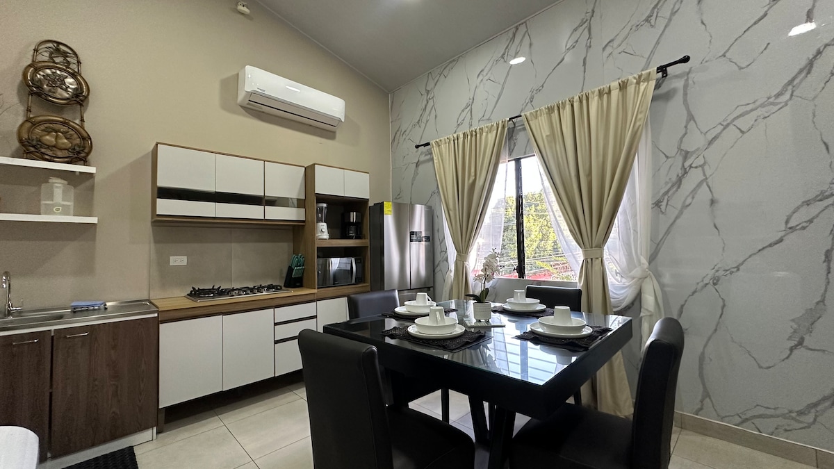 Zasebna stanovanjska, nova in varna na ekskluzivnem območju, stran od hrupa središča mesta, idealno za počitek. V celoti opremljen z vsem, kar potrebujete, da bo vaše bivanje prijetno, polna klimatska naprava, pralni stroj, pametna televizija s kabelsko televizijo, Wi-Fi in dovolj prostora za parkiranje. Park z otroškim prostorom, ki je kot nalašč za otroke. 7 minut od središča mesta. 15 minut od nakupovalnega središča Metrocentro in 1 minuto od novega nakupovalnega središča El Encuentro - El Sitio. 45 minut od najboljših plaž na Orientu.