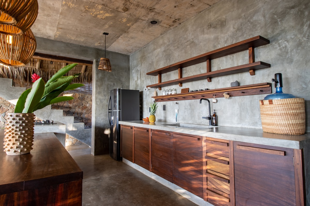 Amazing location, coastal views, modern 4 level open air home; newly constructed with traditional details. Two bedrooms, each with private bathroom and full wrap-around terrace, an extra bedroom on the mezzanine with reduced height, fully equipped kitchen with open air living and dining space, 1/2 bath with outdoor shower, and rooftop lounge area. It has an area of 270 m2 and is located a 15 minutes walk from the beach, on the outskirts of San Agustinillo towards Zipolite.