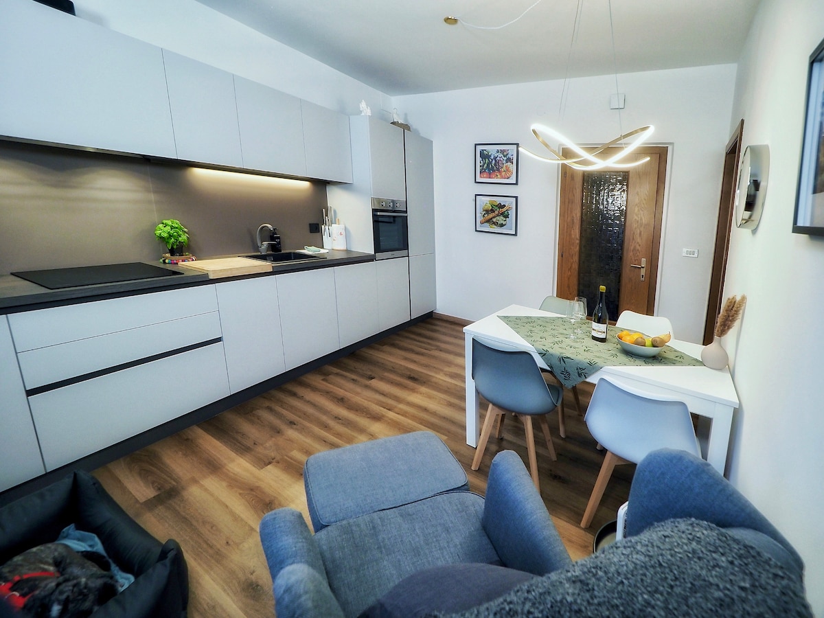 Sodobna hiša z 2 spalnicama, 2 kopalnicama in raztegljivim kavčem za največ 5 gostov. Popolnoma opremljena kuhinja s pečico in pomivalnim strojem. Posebnosti: masažna kad s pogledom na gore, 2 satelitska televizorja, hiter Wi-Fi, ozvočenje, pralni in sušilni stroj. Idealno za izlete na jezero Caldaro, pohode ali kolesarske ture. Brezplačno parkiranje in brezplačna polnilna postaja za električne avtomobile. Rezervirajte zdaj in uživajte v udobju, razkošju in naravi.