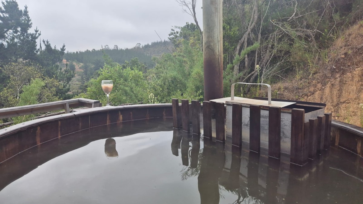 Wooden cabin with hot tub & Starlink, overlooking Cáhuil Lagoon and native forest. Secluded for silence, yet close to beaches, sightseeing, restaurants, and shops for all essentials. Features sunny terraces, skate ramp, fire pit, and gas/wood BBQs. Full cell signal and fast WiFi make it the perfect nature getaway.