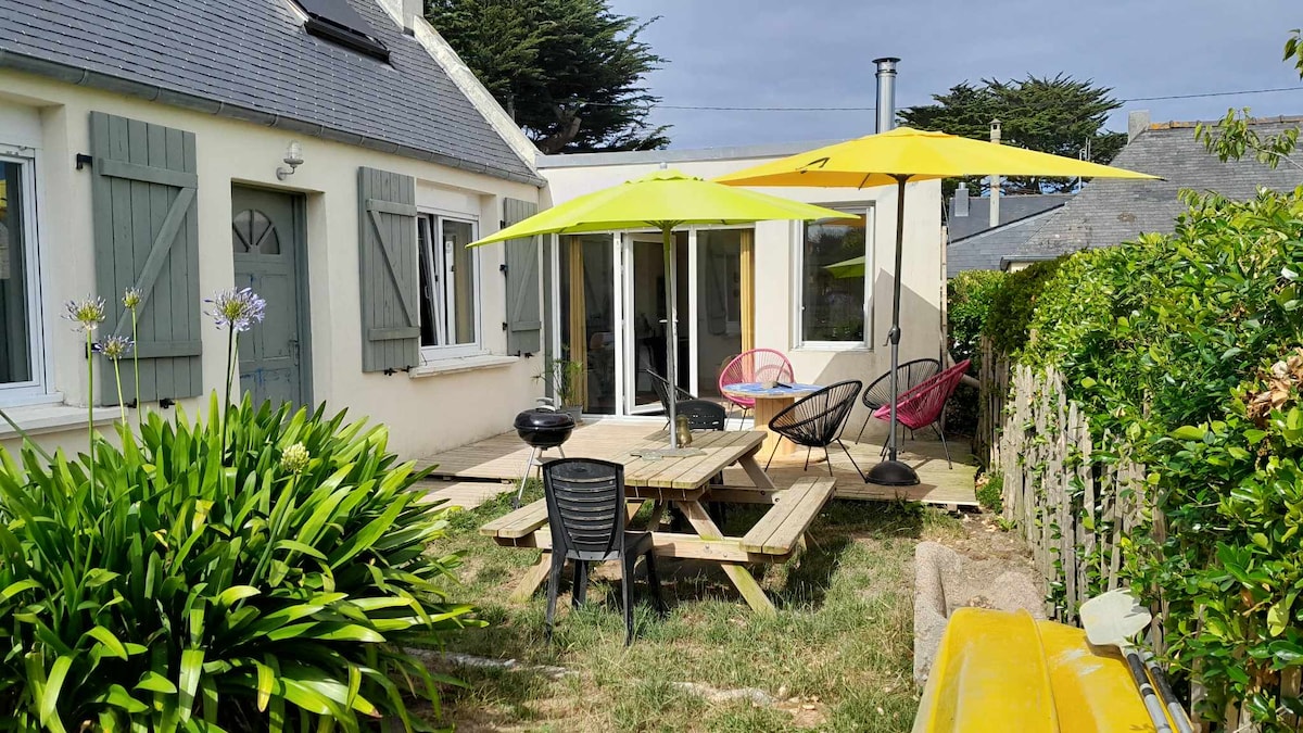 Vrhunska hiša blizu morja (5 minut vožnje z avtomobilom), mirna in s stropom v obliki katedrale. V pritličju so glavna spalnica, ločeno stranišče, opremljena kuhinja in zelo lepa jedilnica. Zgoraj sta medetaža z dnevno sobo in spalnim prostorom z enojno posteljo ter spalnica z dvema posteljama, eno enojno in eno zakonsko. Pridite in si napolnite baterije v Bretanji! S seboj prinesite lastno posteljnino in brisače za roke ter brisače za telo. Pred odhodom boste opravili čiščenje.
