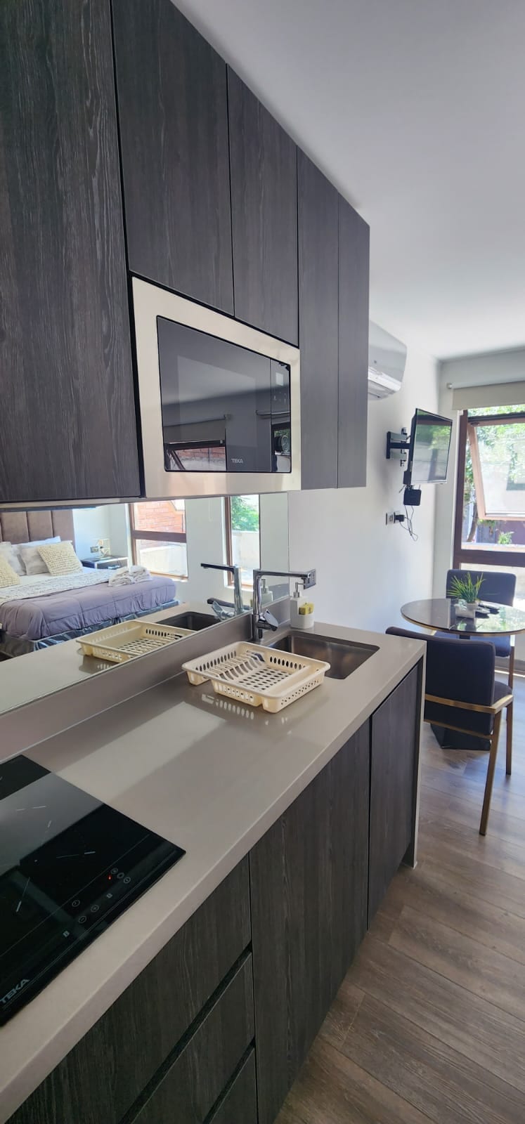 Es un departamento pequeño pero acogedor, con un living comedor conectados al dormitorio. La cocina está a parte y con todos los utensilios necesario para cocinar. El baño tiene un lindo diseño y es muy cómodo de usar. En el living comedor se encuentra el televisor, el cual se puede ver desde el dormitorio. Para el invierno el aireacondicionado funciona como calefacrtor que tira airecaliente.