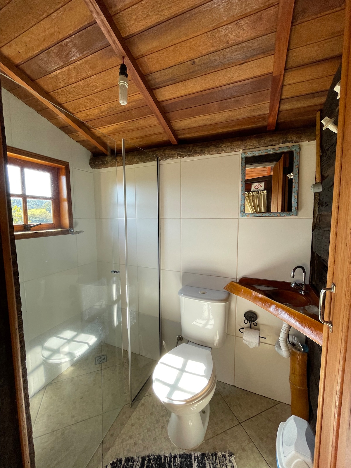 Nosso chalé DA CACHOEIRA conta com vista panorâmica frontal para a cachoeira que passa pela propriedade, varanda, cama Queen-size, roupas de cama e banho, banheira de hidromassagem, espuma de banho, roupões, banheiro privativo com torneira, chuveiro aquecido, lareira com lenha, mesa com duas cadeiras, frigobar, micro-ondas, minicozinha com utensílios. Nosso chalé também conta com internet Wi-Fi e Tv-Smart de 43 Pol, com acesso a Netflix, Youtube, etc. Estacionamento junto da acomodação.