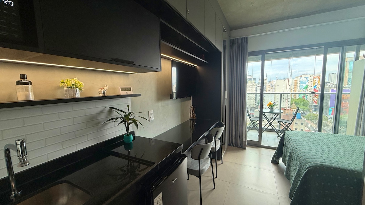 Studio 40011: 4 min do Allianz Parque. Estúdio compacto, moderno e completo e confortável em uma das regiões mais culturais de SP. 📍 Cercado por cafés, restaurantes e shows. Aqui a cidade pulsa ✨ Cama aconchegante, bancada, armário, ar-condicionado, TV, e cozinha equipada com sanduicheira, air fryer, cafeteira, fogão, geladeira. 🚿 Banheiro privativo e iluminação acolhedora. com aquele clima de "quero ficar mais um pouco" Perfeito para curtir, descansar ou trabalhar. Reserve agora!