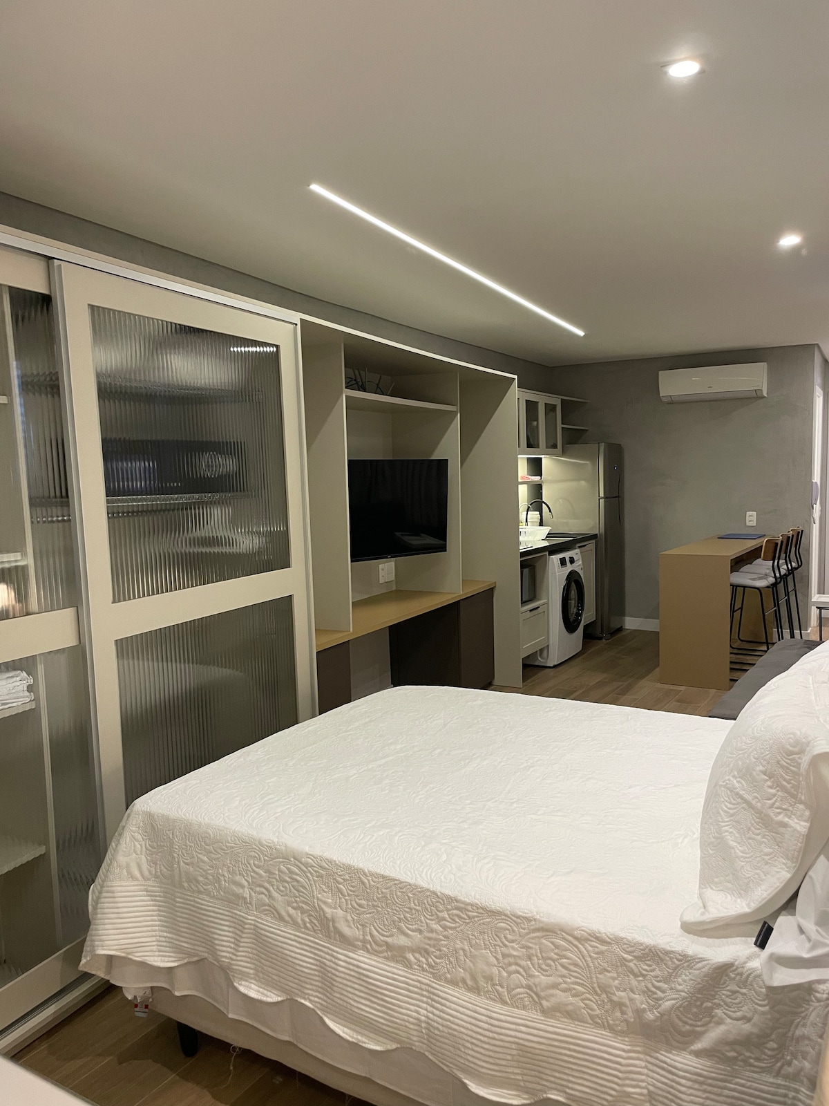 Estamos no bairro Jardim Paulista, ao lado do Parque e Ginásio do Ibirapuera. O studio de 45m2 possui uma cama de casal e sofá cama, um banheiro, uma pequena cozinha, mesa de refeições e ar condicionado. Disponibilizamos um colchão extra se necessário além do sofá-cama. Nosso imóvel é dividido em 3 casas que possuem uma entrada comum. Veja a descrição do espaço para entender nossa infra. Nosso ambiente é familiar, não alugamos para festas. Leiam os comentários dos últimos hóspede