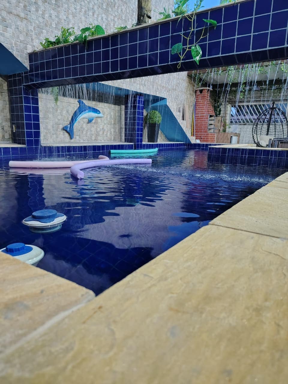 Casa Sol & Sal: Venham curtir a casa com piscina climatizada na Guilhermina, Praia Grande/SP, 600m da praia. Perfeita para momentos de descontração e lazer. Ampla (244m²) e decorada, 4 quartos, sendo 3 suítes (uma com banheira e 2 chuveiros), acomoda até 15 hóspedes. Ar‑condicionado, Wi‑Fi, Smart TVs nos quartos, salas e área da churrasqueira. Mesa de sinuca, pebolim, ping‑pong e muitos jogos. Máquina de gelo, air fryer, bebedouro refrigerado. Garagem p/3 carros. Pet friendly (1 pet) e berço.