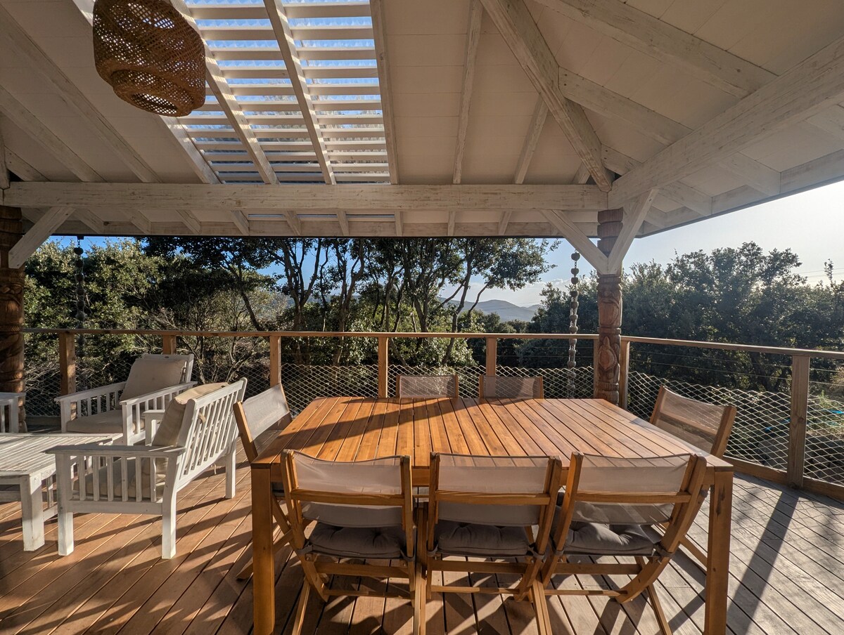 villa entièrement bois, neuve de style bord de mer avec 8 couchages( 2 chambres lits double, 1 chambre 2 lits superposés . il y'a 2 sdb, 2wc. La villa dispose d'une spacieuse terrasse de 100m2 avec un bar extérieur permettant de profiter pleinement de moment de détente en famille. La maison offre une vue dégagée sur la baie de tralicettu. Il y'a un restaurant typique corse à 300m. La villa est adaptée pour les enfants de - de 3ans avec lit bébé et chaise haute.