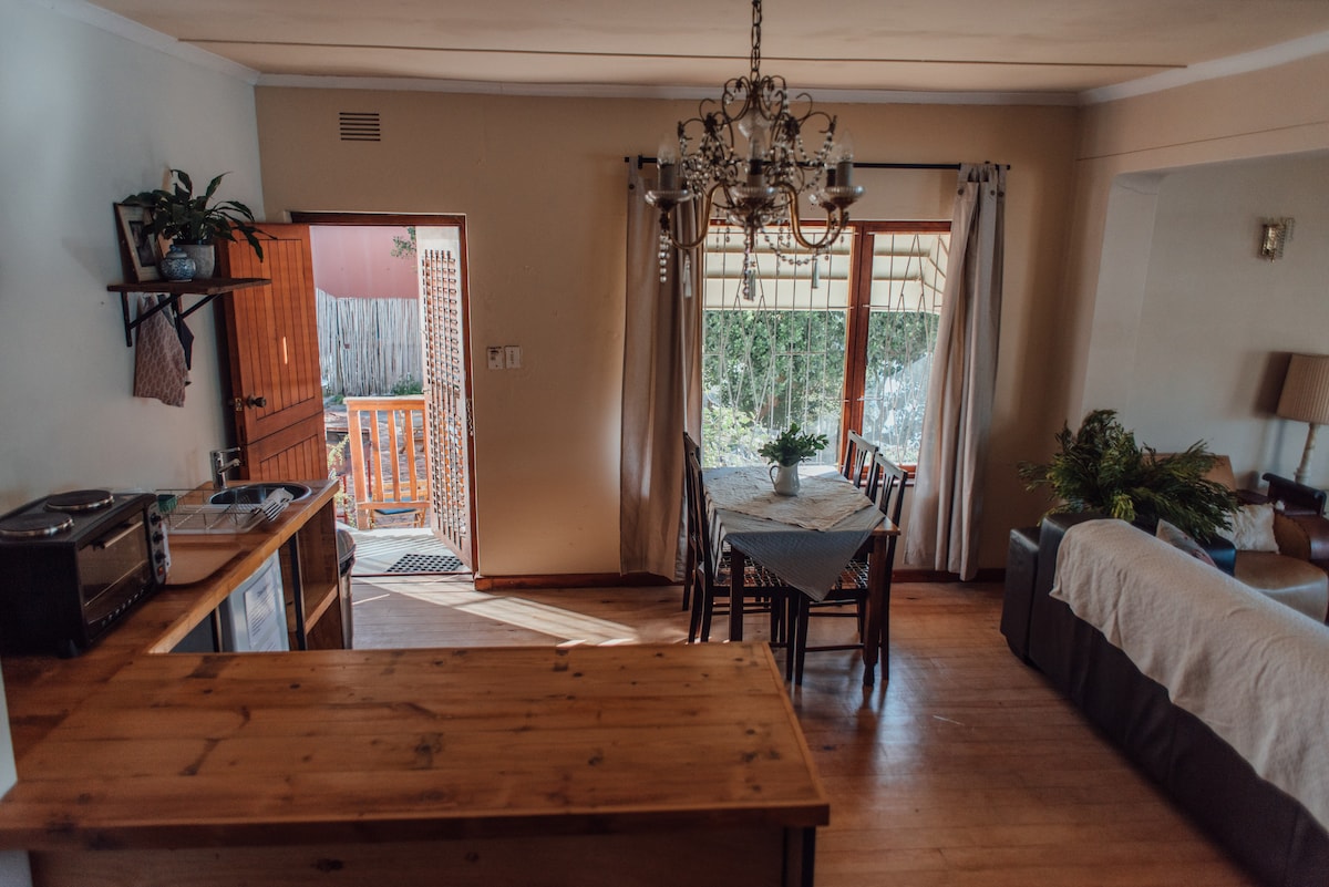 Ta elegantna na novo prenovljena zasebna in sproščena hiška na deželi s sončno energijo je odlična lokacija za družine ali pare, ki želijo doživeti vse, kar ponuja vrtna pot. Nahaja se ob reki Bitou, le 6 km od zaliva Plettenberg. Znana po ptičjem življenju, kolesarskih in tekaških poteh ter dovolj daleč od mesta, da lahko doživite počasnejši tempo življenja. 5 ali 10 minut vožnje do naših najbližjih svetovno znanih vinskih posestev in več plaž z modro zastavo, med katerimi lahko izbirate.