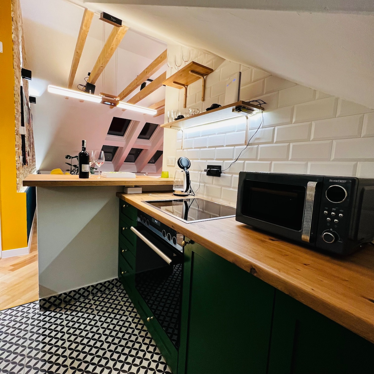 Newly renovated loft in central Sarajevo with bold design, wooden beams, exposed brick, and traditional Bosnian touches. The space blends industrial charm with comfort, featuring hanged exposed lights, vibrant art, and a cosy lounge with fireplace and projector. A highlight is the private 15m² rooftop terrace with unobstructed panoramic city views. Fully equipped kitchen, spa-style bath, and fast Wi-Fi complete this stylish urban retreat.