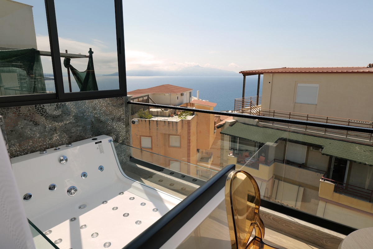 Relax with the whole family at this peaceful place to stay. This is the only apartment in the hotel, it has a kitchen inside, a double sofa bed and one double bed, perfect for a family of 3! The view is spectacular and the sunsets are what makes us love this part of the hotel. A large private veranda reserved solely for this room, featuring a brand new luxury hot tub, overlooking the stunning sea. Ideal for relaxing in complete privacy, complemented by sunbeds for the ultimate holiday experience