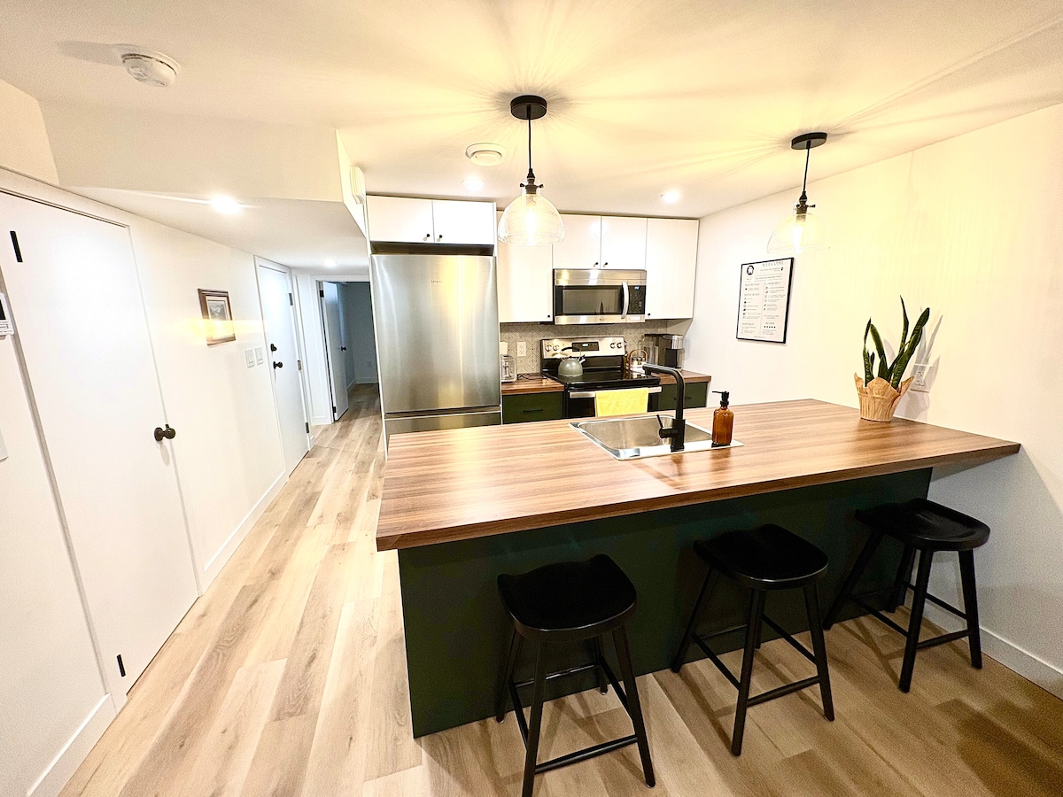 Sprostite se v tem mirnem in elegantnem dvosobnem prenočišču, ki je zasnovano tako, da se boste počutili kot doma, čeprav ste odsotni od doma. 1042 kvadratnih metrov prostora v glavnem nadstropju; našli boste 2 glavni spalnici (za največ 4 odrasle osebe), razkošno kopalnico s 5 kosi, pralnico, popolnoma opremljeno kuhinjo, kavni bar, jedilnico, dnevno sobo z električnim kaminom in dovolj prostora za parkiranje izven ulice. Ne glede na to, ali potujete poslovno ali v prostem času, vam želimo zagotoviti najbolj udobno bivanje in izkušnjo na Airbnbju.