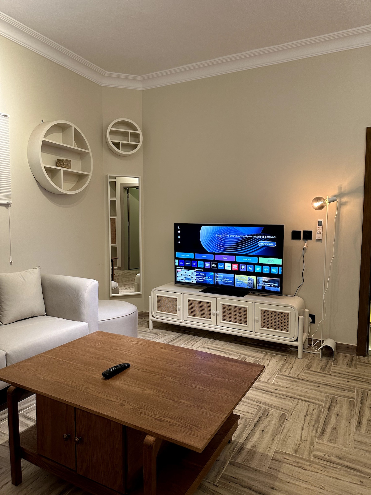 Razkošen in sodoben studio v prestižni soseski Al Aqeeq, le nekaj minut od bulvarja in finančnega centra kralja Abdulaha (KAFD). Ima zvočno izolacijo, ki zagotavlja popoln mir, s pametnim 70-palčnim zaslonom in samostojno namestitev za popolno prilagodljivost. Idealno za popotnike in poslovneže, ki iščejo zasebnost in udobje na posebni lokaciji.