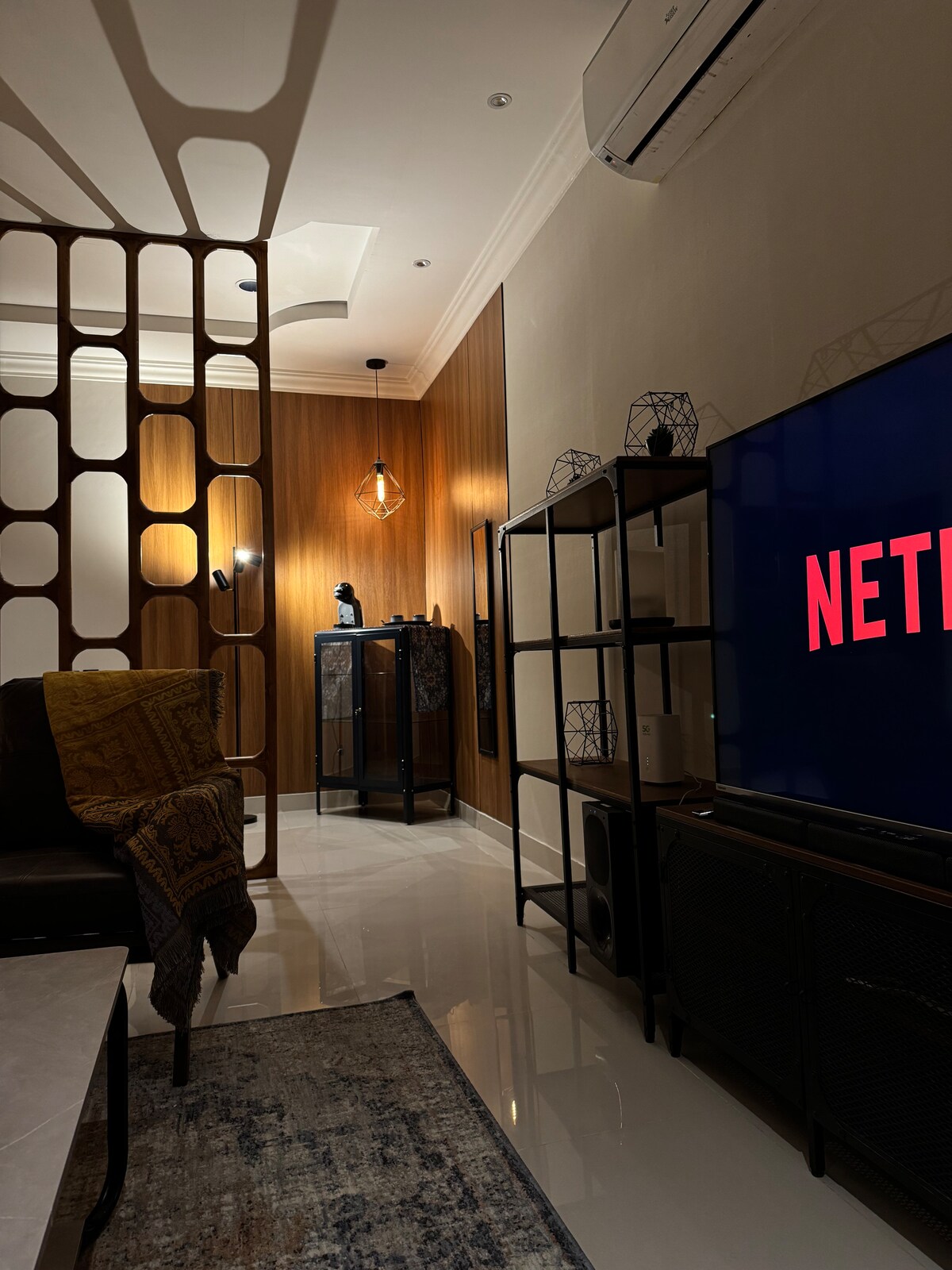 Sodobna in elegantna samostojna kuhinjska soba in bivalni prostor s pametnim dostopom,ki vključuje udobno ležišče, domači kino,kavarno, zatemnitvene luči, osvežilcem zraka, 60-palčnim pametnim zaslonom, povezanim z internetom 5G, in zelo udobnim bivalnim prostorom. Vsebuje storitve (hladilnik, električna pečica,grelnik vode, aparat za kavo, mikrovalovna pečica,skodelice in pripomočki) Število gostov do 4 osebe. Edinstvena lokacija severno od soseske Riyadh Kairouan v bližini: 2 minuti skozi King Salman 4 minute po cesti King Fahd Road 18 minut do bulevara. 20 minut od letališča.