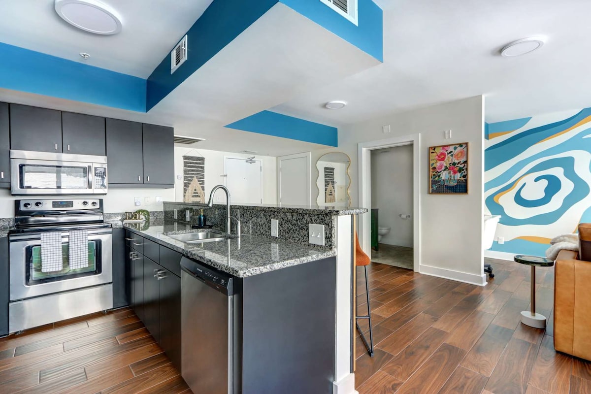 Dobrodošli v elegantnem in umetniškem stanovanju The Blue Oyster at Drayton Tower, elegantnem in umetniškem stanovanju v 6. nadstropju ene najbolj legendarnih stavb Savannah iz sredine prejšnjega stoletja - Drayton Tower na ulici 102 E. Liberty Street. Sodoben umik s čudovitim razgledom, lokalnimi umetniškimi stenskimi poslikavami in razkošnim masažnim stolom ponuja popolno ravnovesje med udobjem, kulturo in priročnostjo. Ne glede na to, ali ste na obisku zaradi romantičnega vikenda, poslovnega potovanja ali raziskovanja šarma Savanne s prijatelji, vas čaka poslastica.