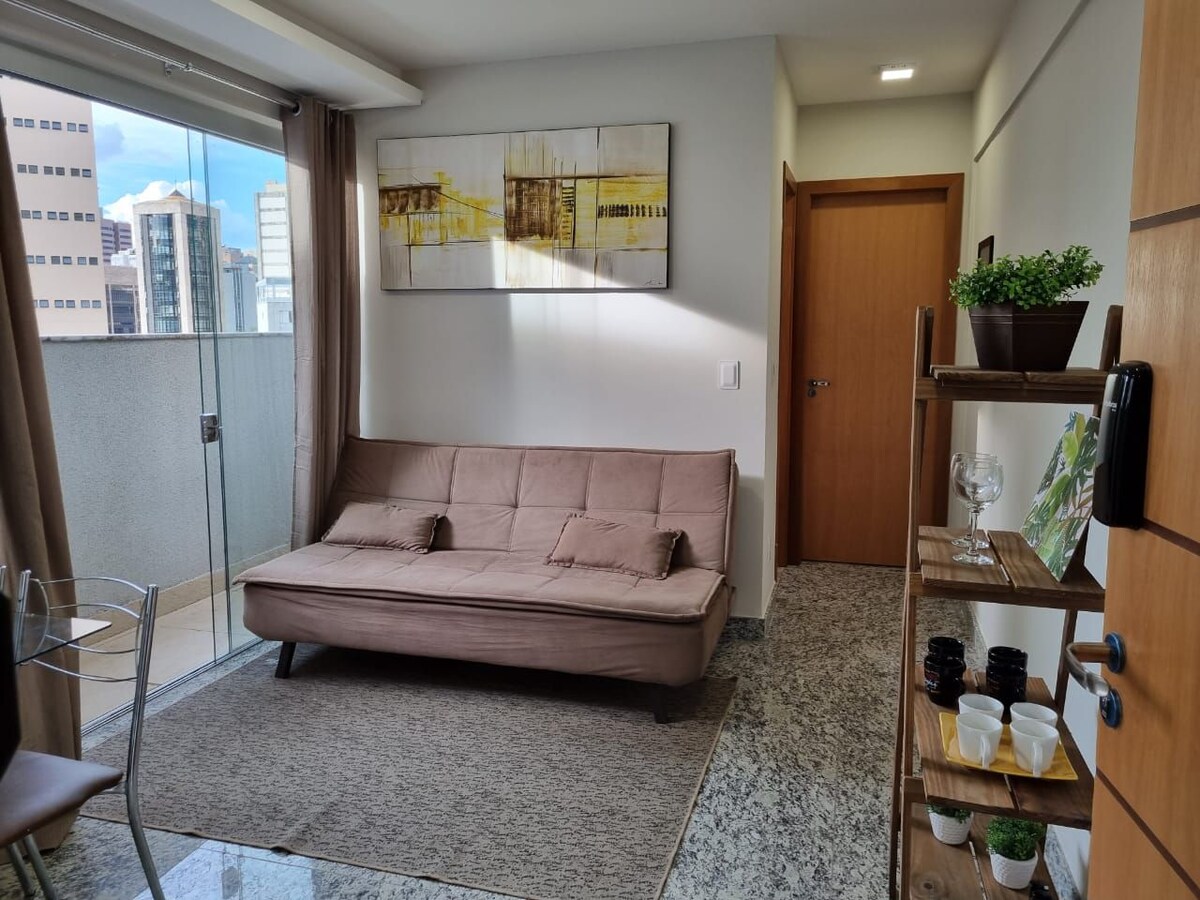 Apartamento novo, bem ventilado, bem equipado, uma vaga de garagem coberta, com elevador! Localizado no quarteirão fechado da Praça da Savassi, fácil acesso ao centro da cidade, próximo ao Shopping Pátio Savassi e demais comércios. Foi mobiliado recentemente para hospedar clientes exigentes e de bom gosto! 120Mg de Wi-fi. Um pequeno apartamento com uma sala, cozinha conjugada e suite com closet.