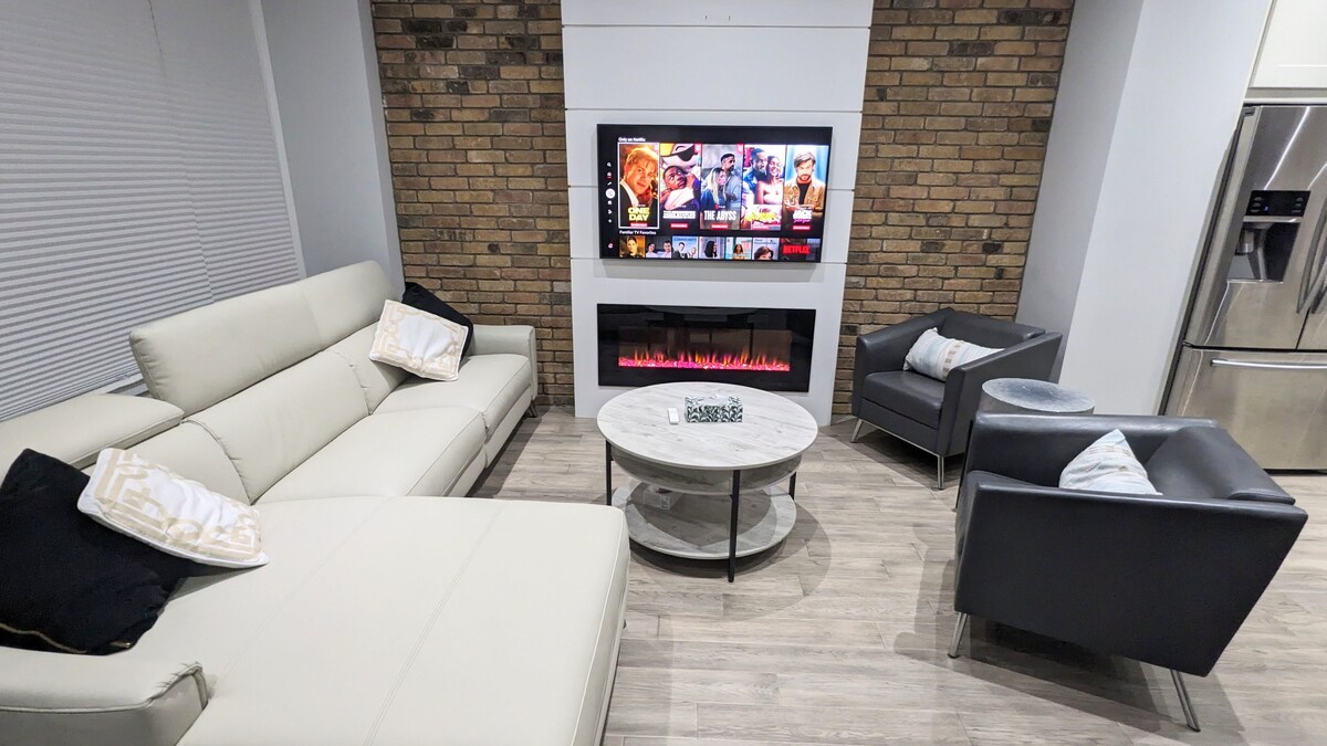 Purpose-built for remote workers and business travellers: 1.5Gbps dedicated fiber, 24” monitor, ergonomic chair, and a private walkout entrance so your workday starts the moment you arrive. Travel on your own terms with early check-in and a rare 3 PM late checkout. Located minutes from Pickering GO Station (downtown Toronto in ~45 min), this 600sqft executive suite offers a King bed, sofa bed, and full kitchen with total indoor privacy. Wind down by the gas fireplace after a long day.