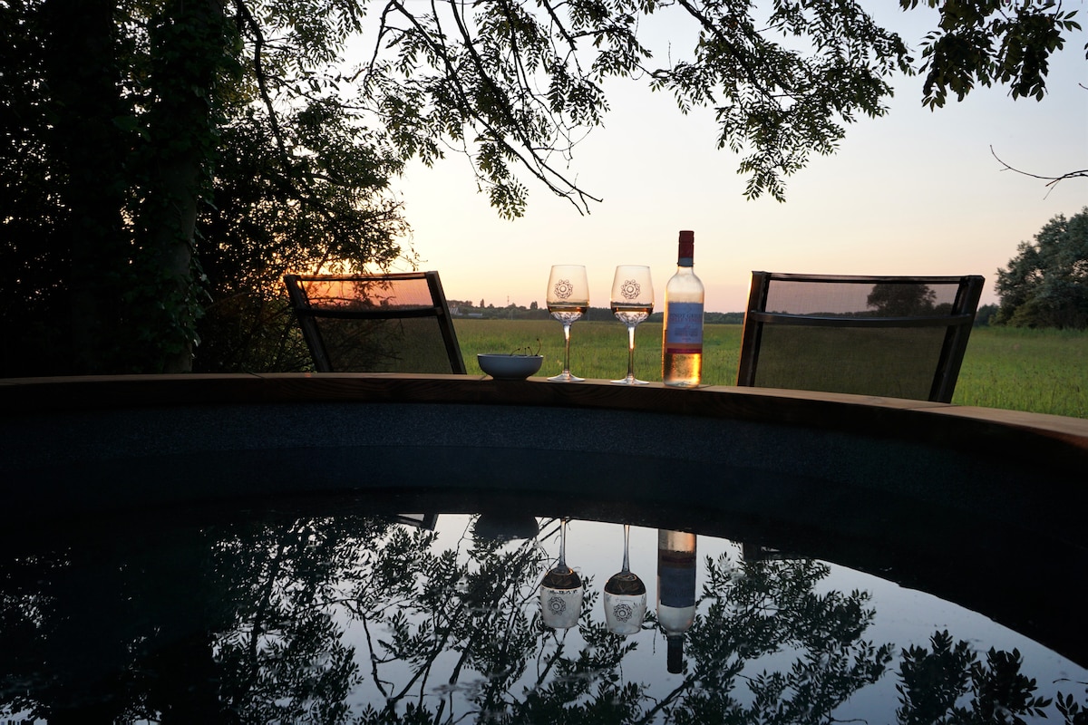 Na robu našega posestva se nahaja ta čudovita wellness koča z zasebno masažno kadjo. Iz te lesene vroče kopeli se odpira čudovit pogled na prostrano poljsko pokrajino. Tu lahko uživate v sončnem zahodu, medtem ko uživate v pijači ali se sproščate na enem od ležalnikov. Koča je popolnoma opremljena, tako da imate na voljo kuhinjo z obsežno kuhinjsko opremo in pomivalnim strojem.