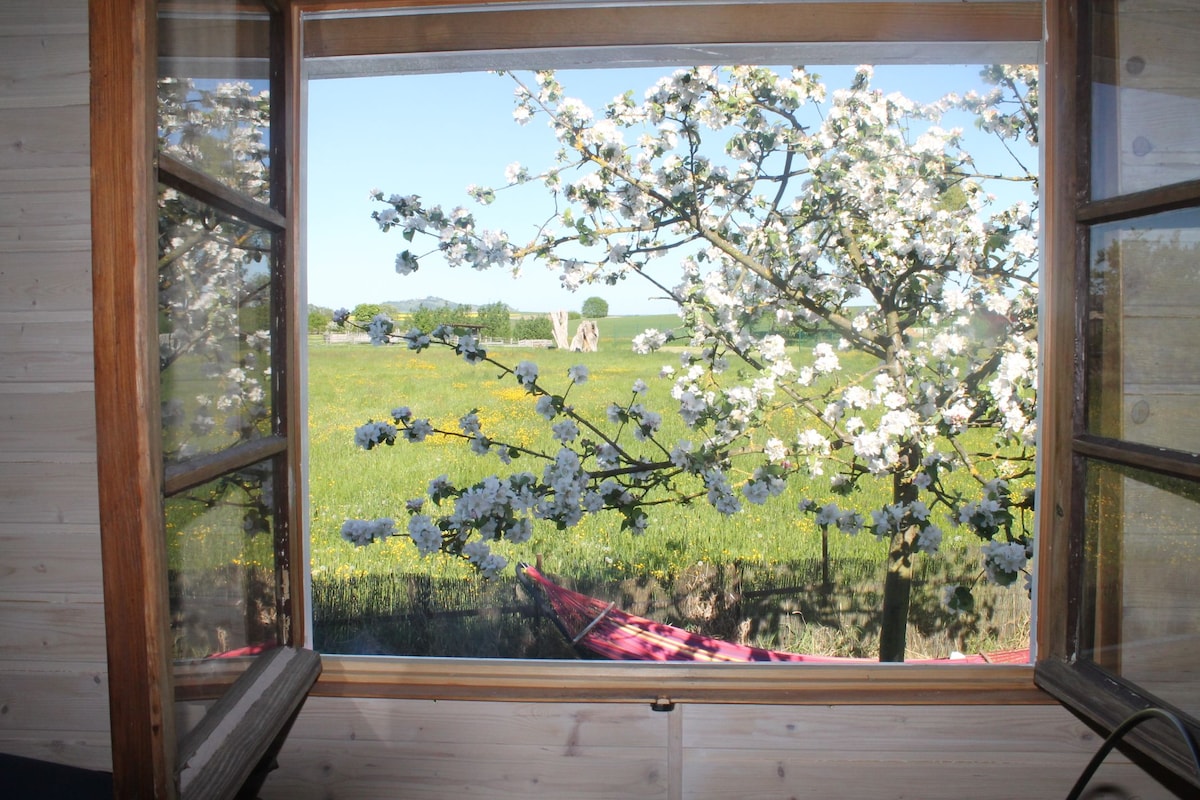 Lesena hiša 13 m2 sredi našega velikega sadovnjaka z mini kuhinjo, štedilnikom na drva, plišastim straniščem in sončno energijo. Obstajata 2 postelji, ki ju lahko postavite kot zakonsko posteljo ali enojno posteljo. Naj bo preprosto, brez televizije in Wi-Fija, ampak veliko MIRU in NARAVE. Na voljo je vrt s sončno gugalnico, kaminom in tipijem (poleti). Hiša je 30 m stran in na voljo je prha, ki jo lahko uporabljate od 7.30 do 22.00 in kjer lahko odložite umazano posodo.