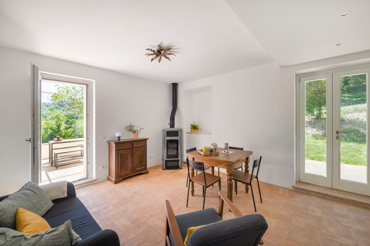 Majhna vasica le 5 km od čudovitega Todija. Stanovanje se nahaja znotraj starodavne zgradbe iz leta 1200 z majhno cerkvijo iz tistega časa. Samo prenovljeno stanovanje ima pristne značilnosti, z retro okusom in hkrati sodobnim, ta udobna hiša ponuja čudovit razgled na mesto Todi. Vse, kar uokvirjajo zeleni umbrijski hribi.